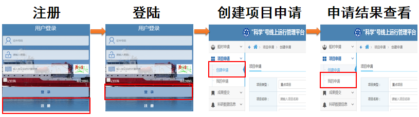 4、申请方式:注册并登录“科学”号线上运行管理平台,在“项目申请”模块在线填报项目申请(申请步骤见附件1)